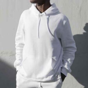 Moletom Flanelado 3 cabos / 330 GR, nas cores Preta / Branca / Mescla Clara, acabamento com capuz e bolso canguru.